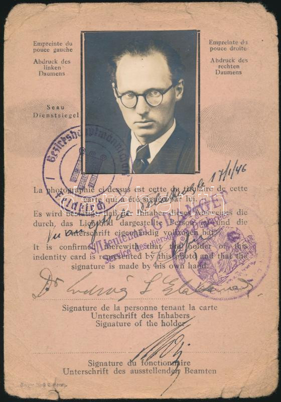 Beschreibung: 1945 Menekült igazolvány tolmács férfi részére kiállítva, fényképes/ Carte d'identité for interpreter