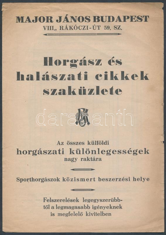 cca 1910-1920 Bp. VIII., Major János horgász és halászati cikkek szakü... https://www.darabanth.com/de/236-Fernauktion/236.0/Andere-Sammelgebiete/Drucksachen~400007/cca-1910-1920-Bp-VIII-Major-Janos-horgasz-es-halaszati-cikkek-szakuzletenek-abrakkal-illu~II1087564