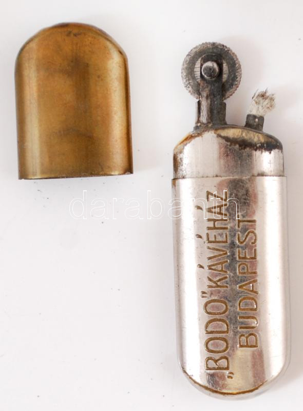 "BODO" Kávéház Budapest fém öngyújtó, h: 7 cm https://www.darabanth.com/de/236-Fernauktion/236.0/Andere-Sammelgebiete/Flohmarkt~400022/BODO-Kavehaz-Budapest-fem-ongyujto-h-7-cm~II1087717
