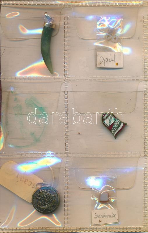 Beschreibung: Érdekes kitűzők, gombok, medálok, gyöngyök berakóban, 15 db