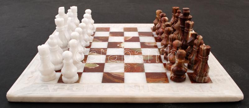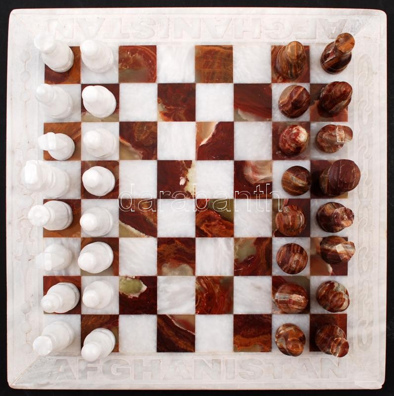 Beschreibung: Faragott mészkő sakk készlet, "Afghanistan " felirattal, kis lepattanással, 30×30 cm