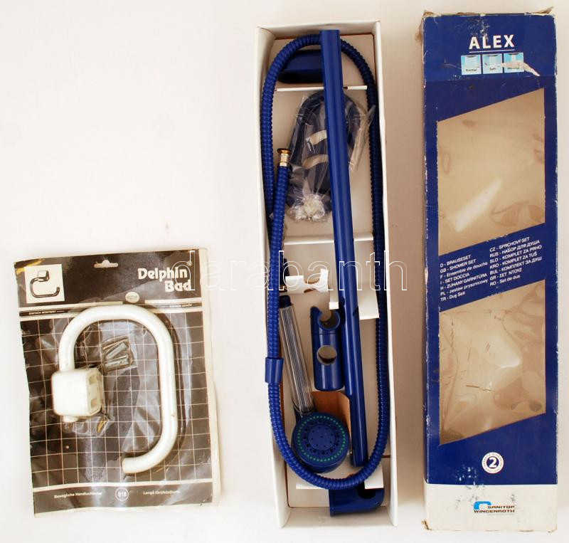 Beschreibung: Fürdőszobakellékek: törölközőtartó + zuhanygarnitúra, kicsit sérült saját dobozaikban