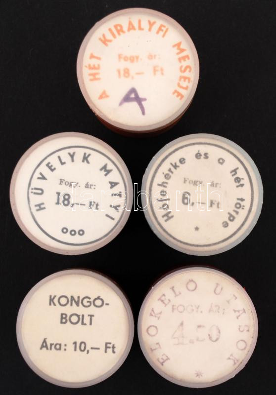 Beschreibung: Mesék és más történetek diafilmen: Hófehérke és a hét törpe, Kongóbolt, Előkelő utasok, A hét királyfi meséje, Hüvelyk Matyi, 5 db