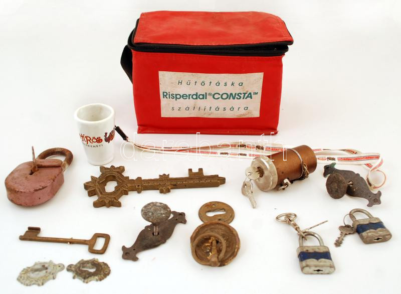 Beschreibung: Vegyes lakat és kulcs tétel: Kipufogózár kulccsal, díszkulcs, szekrénygombok és -díszek st., kicsit kopott, kisméretű hűtőtáskában