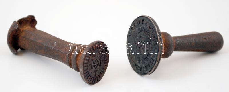 Beschreibung: cca 18. század 2 db fém egyházi pecsétnyomó, egyiken Máriapócs felirattal, h: 5 és 5,5 cm