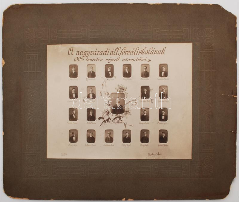 1907 A nagyváradi állami főreáliskolának 1906/1907. tanévben végzett növendékei, kistabló 20 nevesített portréval Lembert Ede fényképész műterméből, 17x22 cm, karton (sérült) 30x36 cm
