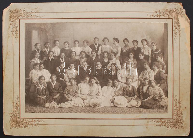 Beschreibung: 1909 Marosvásárhely, a Ferences-rendi zárda 4. osztályos növendékei, nevük hátul felsorolva, 18x27 cm, karton (sérült, foltos) 27x37 cm