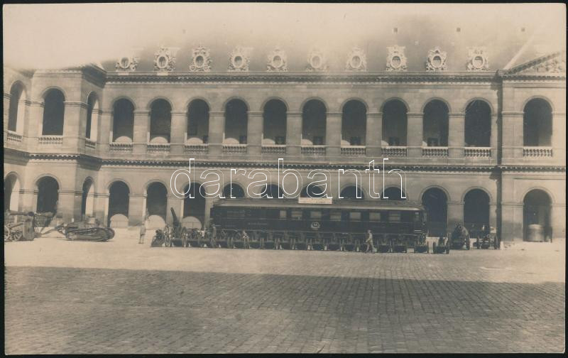 1918 Ferdinand Foch(1851-1929) francia marsall vasúti kocsija, a fegyverszüneti tárgyalások helye, fotólap, hátoldalon feliratozva, 14x9 cm /