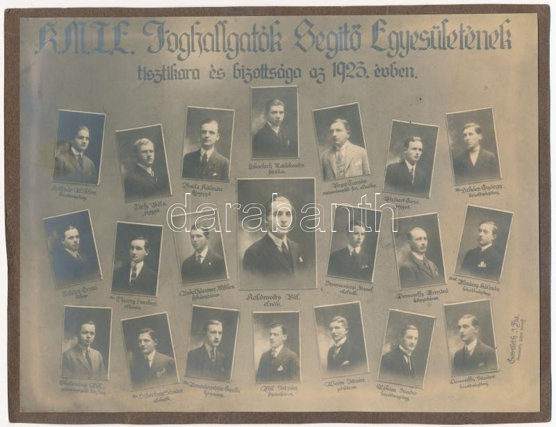 1923 K.M.L.E. Joghallgatók Segítő Egyesületének tisztikara és bizottsága az 1923. évben, tablófotó 21 nevesített portréval, kartonra ragasztott fotó, 22x17 cm