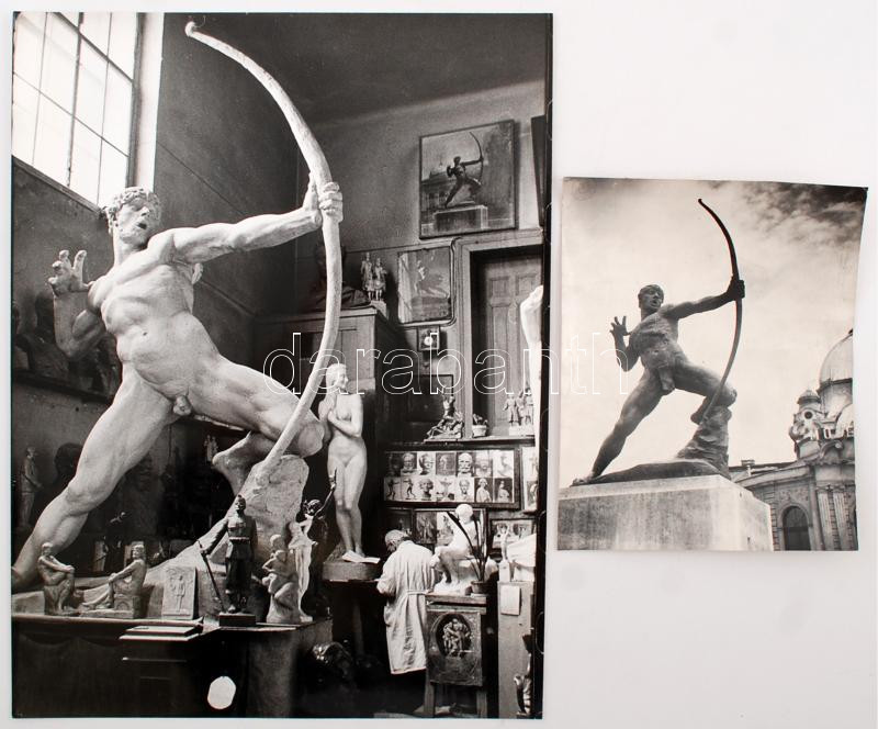 Kisfaludi Strobl Zsigmond: Íjász szobor a Városligetben (1929), Tiszavölgyi József jelzett felvétele (cca 1950) és a szobrászművész műtermében (cca 1960), 21x16 cm és 40x30 cm