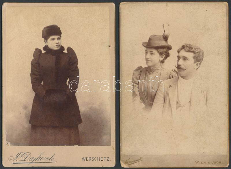 cca 1860-1890 Szép nők, szép párok a múltszázad fordulójáról, nagy méretű, keményhátú kabinet fotók, 3db, mind más budapesti ill., bécsi műteremből, különböző minőségben és méretben