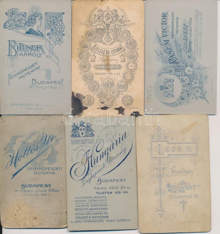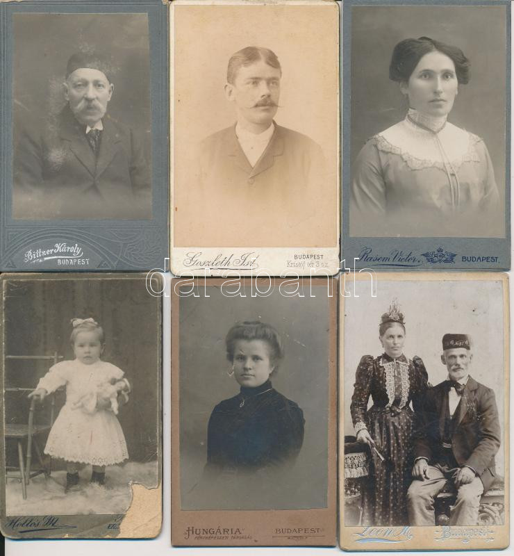 cca 1860-1900 Korabeli, keményhátú családi fotók, különböző budapesti műtermekből:Goszleth, Hollós, Bittner, Leon, Hungária, Rasem, 6db, cca10x6cm
