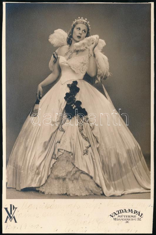 cca 1935 Vajda M. Pál felvétele talán egy színésznőről, opera énekesről, a dedikáció alul kihalványult, hátul egy családnév olvasható, kutatásra érdemes felvétel, 18x12 cm