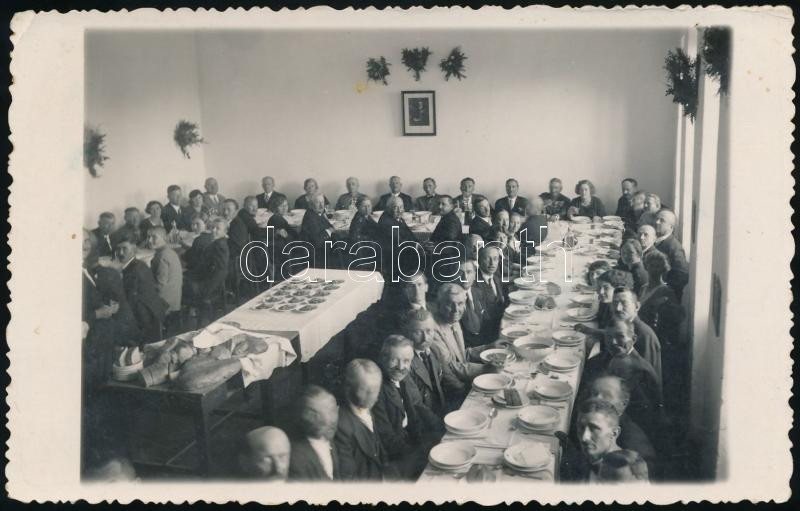 Beschreibung: cca 1940 Mendek fényképész (Tokaj): Bankett, a háttérben levő falon Horthy arcképe, pecséttel jelzett, 9x14 cm