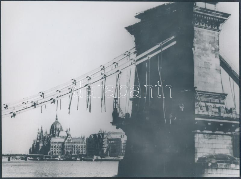cca 1945 Budapest, a Lánchíd maradványa, s mögötte a Kossuth híd, dr. Kunszt János (1892-1960) korabeli felvételéről készült későbbi nagyítás, 17x23 cm