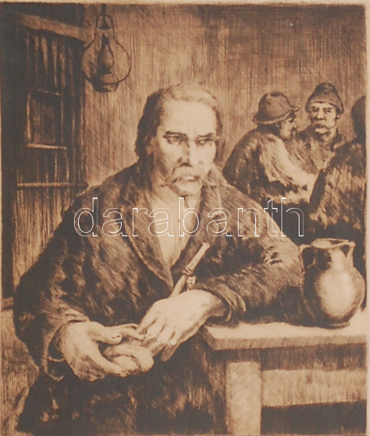 Beschreibung: Csillag József (1894-1977): A csárdában. Rézkarc, papír, jelzett, üvegezett antik keretben, 34×28 cm