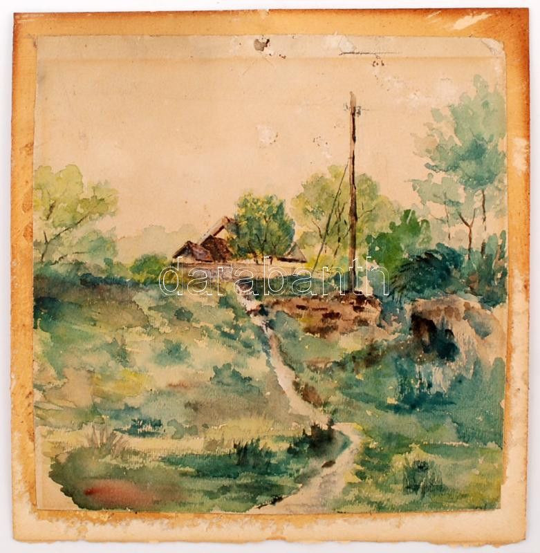 Beschreibung: Jelzés nélkül: Ösvény a faluhoz. Akvarell, papír, jelzett, hibás, 18×18 cm