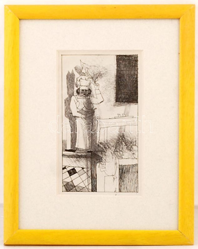 Beschreibung: Kondor Béla (1931-1972): Illusztráció (Gyámoltalan hősök.). Rézkarc, papír, jelzés nélkül, üvegezett keretben, 15×8 cm