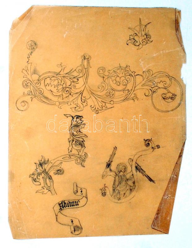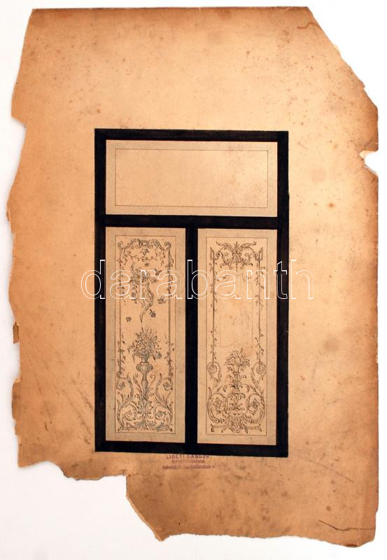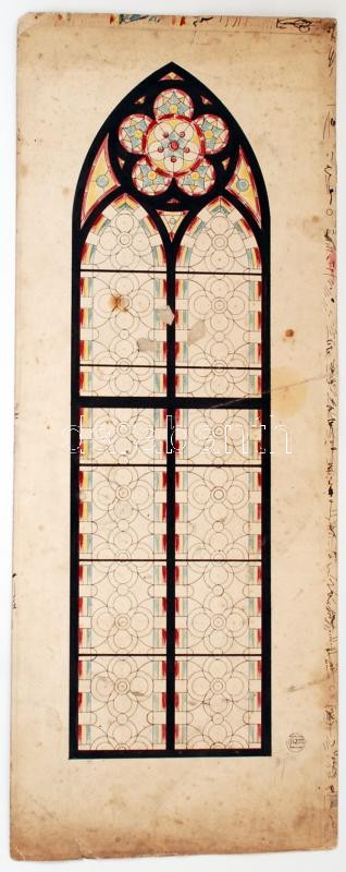 Ligeti Sándor: Ablaküveg tervrajz 2db. Vegyes technika, papír, egyik pecséttel jelzett, sérült, 30×21 cm, különböző díszítő rajzok, ceruza, pauszpapír, szakadásokkal, 24×20 cm