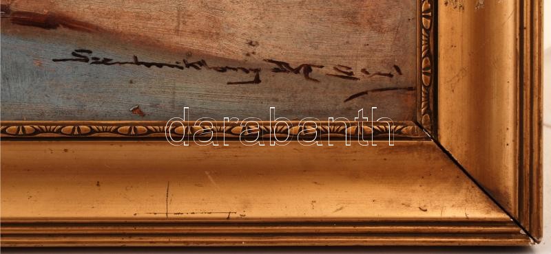 Beschreibung: Olvashatatlan jelzéssel: Falusi életkép a folyóparton, olaj, karton, fa keretben, 52×65,5 cm