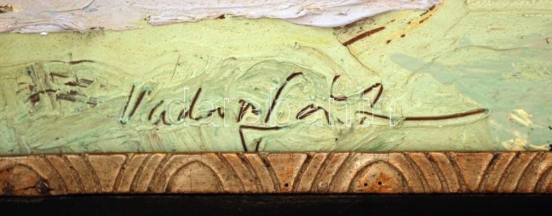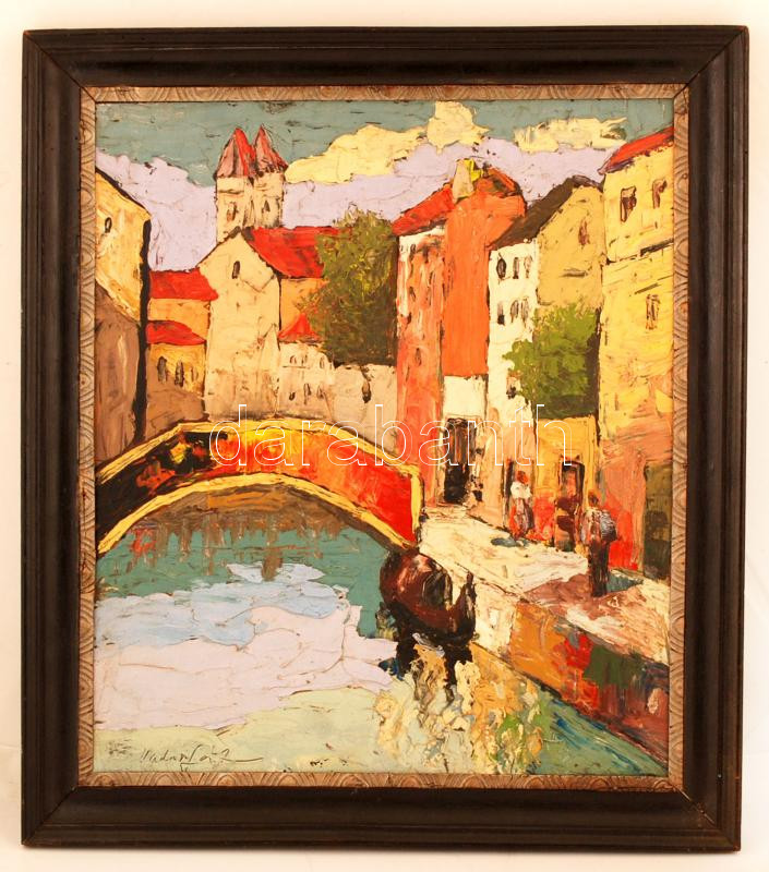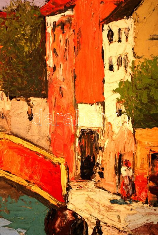 Beschreibung: Olvashatatlan jelzéssel: Utca részlet. Olaj, farost, keretben, 60×50 cm