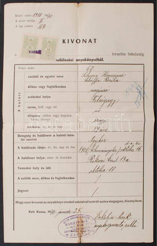 1940 Eckstein Márk kassai rabbi saját kézzel aláírt dokumentum / Autog... https://www.darabanth.com/de/236-Fernauktion/236.0/Andere-Sammelgebiete/Judaica~400002/1940-Eckstein-Mark-kassai-rabbi-sajat-kezzel-alairt-dokumentum-Autograph-signed-document-of-t~II1084218