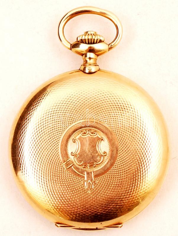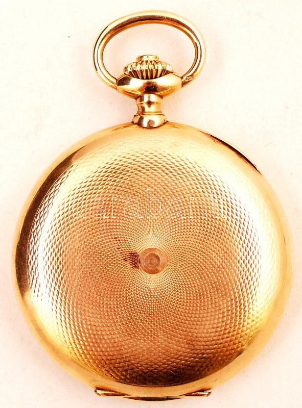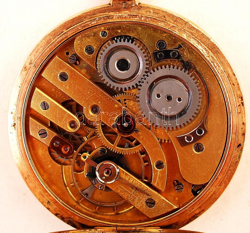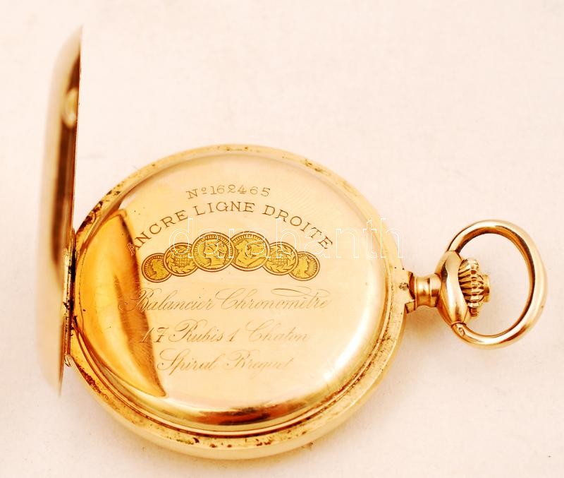 Ancre Ligne Droite arany 14 K (Au.) másodperc mutatós, dupla fedeles zsebóra, működik, jelzett, számlapon apró hajszálrepedéssel, bruttó: 101 gr. / Ancre Ligne Droite france pocketwatch, 14 K gold, works well