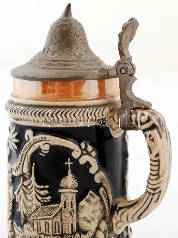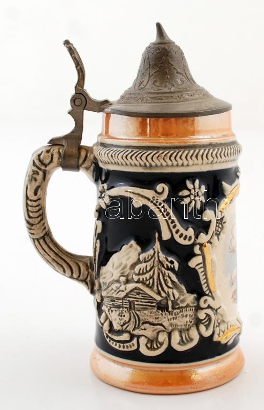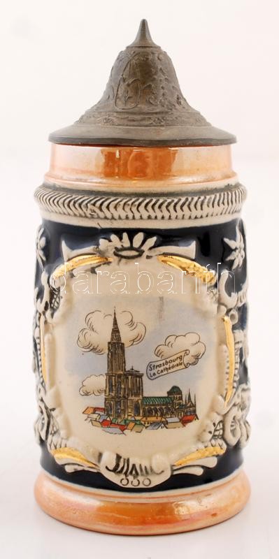 Beschreibung: Emlék korsó "Strasbourg" felirattal, mázas fajansz, ón tetővel, matricás, jelzés nélkül, m: 13
