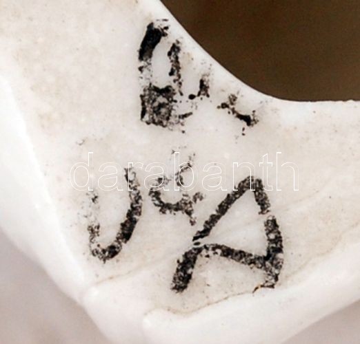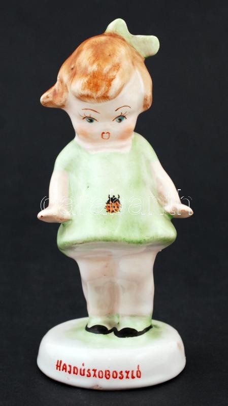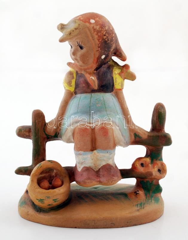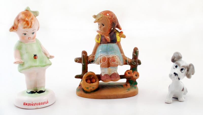 Kerítésen ülő kislány, kisméretű kerámia szobor, kézzel festett, jelzés nélkül, kis lekopásokkal, m: 12,5 cm + 2 db figurális porcelán: katicabogárral találkozó kislány, kézzel festett, jelzett, "Hajdúszoboszló" felirattal, apró kopásnyomokkal, m: 12,5 cm; levehető fejű porcelán kiskutya, kézzel festett, jelzett, kis kopásnyomokkal, m: 6,5 cm