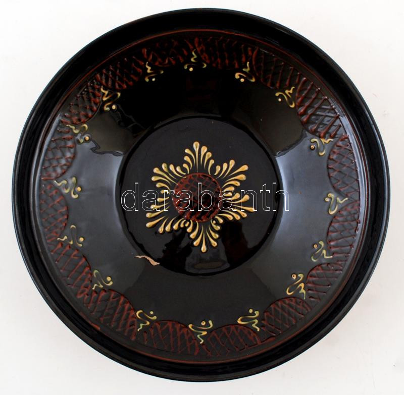 Beschreibung: Nagy, mázas kerámia tál, kézzel festett, jelzés nélkül, d:31cm