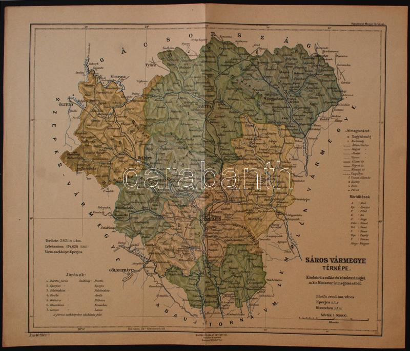 1915 Sáros Vármegye térképe. 1:300 000, Kiadatott a vallás és közoktatásügyi m. kir. Miniszter úr megbízásából. Magyar Földrajzi Intézet. Szép állapotban. 32x40cm