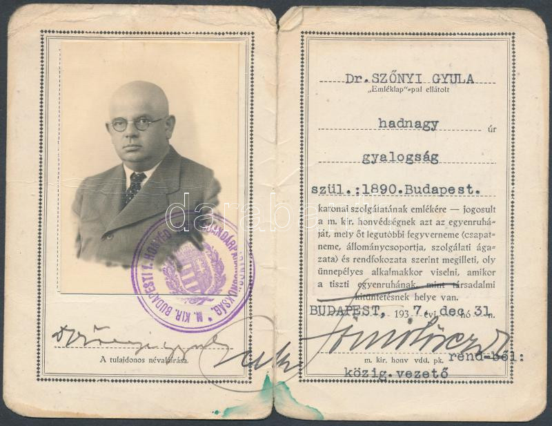 1937 Bp., M. Kir. Budapesti 1. Honvéd Vegyesdandárparancsnokság által Dr. Szőnyi Gyula gyalogsági hadnagy részére katonai szolgálata emlékére kiállított emléklap