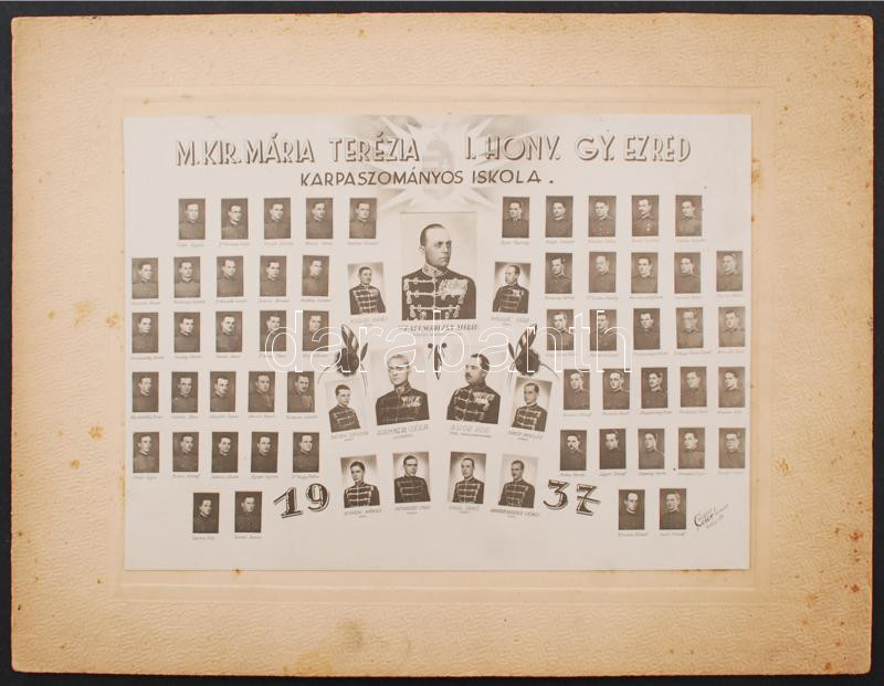 Beschreibung: 1937 M. kir. Mária Terézia I. Honvéd gyalogezred karpaszományos iskolájának végzett hallgatói, 65 nevesített portréval, 17x23 cm, karton 25x33 cm