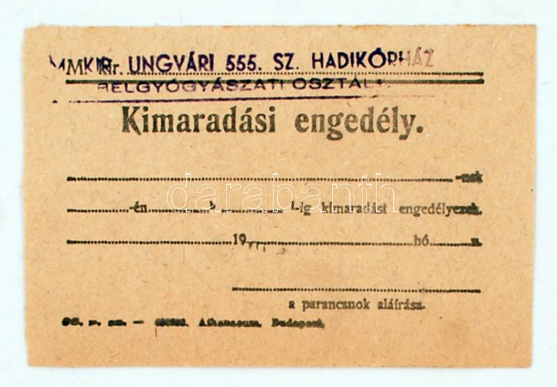 Beschreibung: cca 1930-1945 M. Kir. Ungvári 555. számú Hadikórház Belgyógyászati Osztályának kitöltetlen kimaradási engedélye