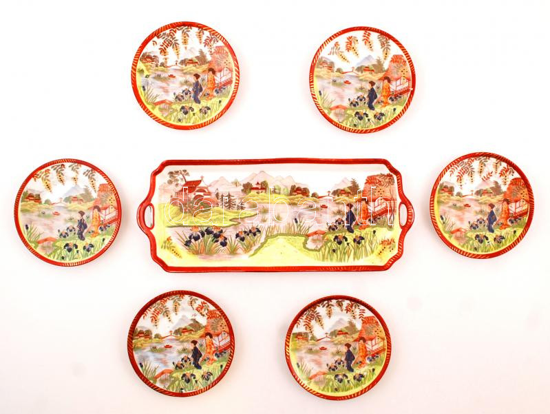 Beschreibung: Japán porcelán süteményes tál 6 db kistányérral, kopásnyomokkal, jelzett