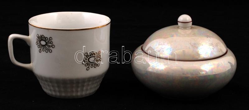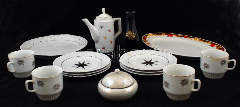 Vegyes porcelán tétel: bögrék, tálak, tányérok, gyöngyházfényű bonbonier, stb., több közülük jelzett (Hollóházi, csehszlovák, stb.), kopásnyomokkal, különböző méretben