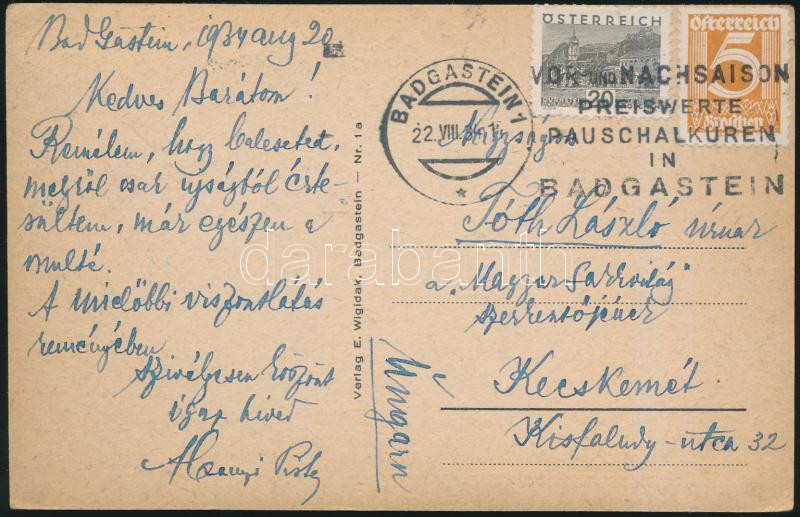 Beschreibung: 1934 Levelezőlap Tóth Lászlónak, a Magyar Sakkvilág szerkesztőjének, kecskeméti polgármesternek Abonyi István(1886-1942) sakkmestertől