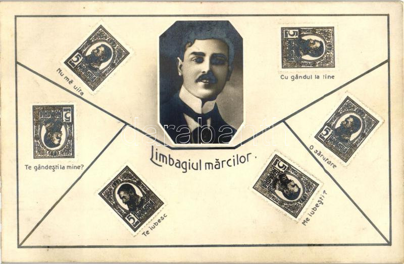 Limbagiul marcilor / Romanian Stamp language postcard https://www.darabanth.com/de/236-Fernauktion/236.0/Ansichtskarten/Briefmarken~57/Limbagiul-marcilor-Romanian-Stamp-language-postcard~II1081405