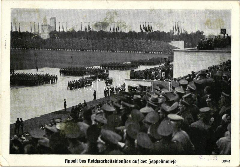 1938 Nürnberg, Reichsparteitag, Appell des Reichsarbeitsdienstes auf der Zeppelinwiese / WWII German Reich Labor Service, Zeppelin field, So. Stpl (EK)
