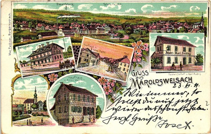 Maroldsweisach, Basaltfabrik, Bahnhof, Hauptstrasse, Gastwirtschaft von Karl Anding, Kaufhaus von Aron Hecht, Kirche / Basalt factory, railway station, main street, restaurant, department store, church, Art Nouveau, floral, litho (EB)
