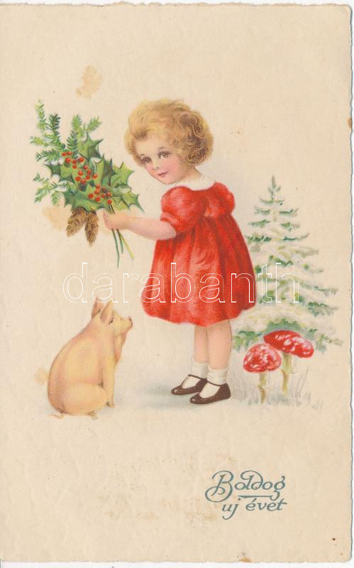 New Year, girl with pig, mushrooms, 3483. litho (Rb) https://www.darabanth.com/de/236-Fernauktion/236.0/Ansichtskarten/GruC39Fkarte~124/New-Year-girl-with-pig-mushrooms-3483-litho-Rb~II1086924