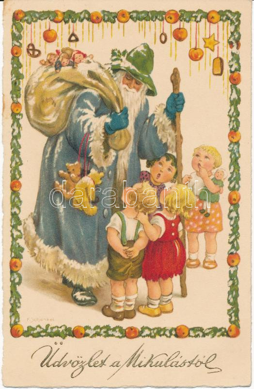 Saint Nicholas, children, litho s: F. Schenkel https://www.darabanth.com/de/236-Fernauktion/236.0/Ansichtskarten/GruC39Fkarte~124/Saint-Nicholas-children-litho-s-F-Schenkel~II1086760
