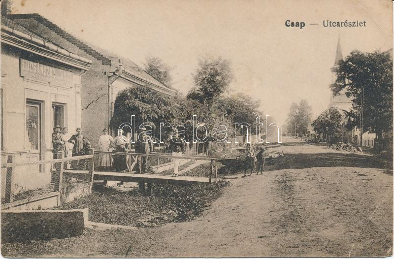 Beschreibung: Csap, utca, Lucsánszky János fűszer és vegyeskereskedése / street, shop (b)