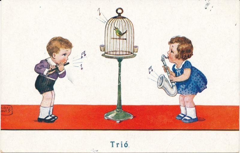 Trió / Children, saxophone, flute, bird, W.S.S.B. 5055. s: John Wills https://www.darabanth.com/de/236-Fernauktion/236.0/Ansichtskarten/Kinder~74/Trio-Children-saxophone-flute-bird-WSSB-5055-s-John-Wills~II1086726
