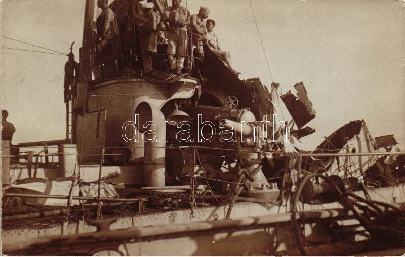Beschreibung: 1916-a francia Bernoulli tengeralattjáró által megtorpedózott SMS Csepel torpedónaszád / Hungarian torpedo boat damaged by a French shell, photo