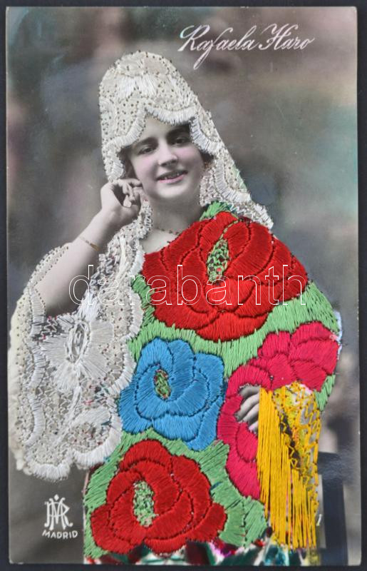Rafaela Haro, singer. crochet decorated / silk card (layers apart) https://www.darabanth.com/de/236-Fernauktion/236.0/Ansichtskarten/Musik-Musikanten~105/Rafaela-Haro-singer-crochet-decorated-silk-card-layers-apart~II1080905