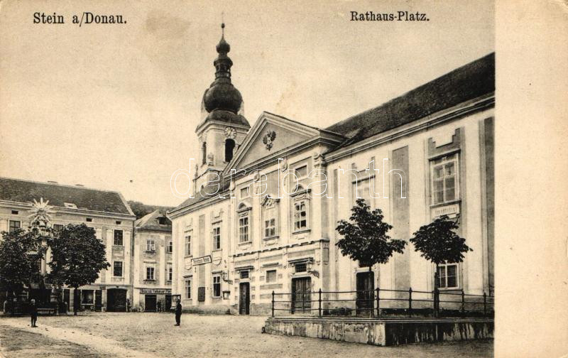 Beschreibung: Krems an der Donau, Stein, Rathaus-Platz, Vorschuss Verein / town hall, square, loan bank, shop of Heinrich Viebauser (fa)