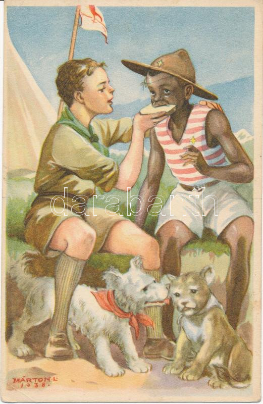 A cserkészt minden cserkészt testvérének tekint; Cserkész fekete fiúval; Cserkész Levelezőlapok Kiadóhiavatal Klössz Coloroffset / Scout with black boy s: Márton L. (EK)