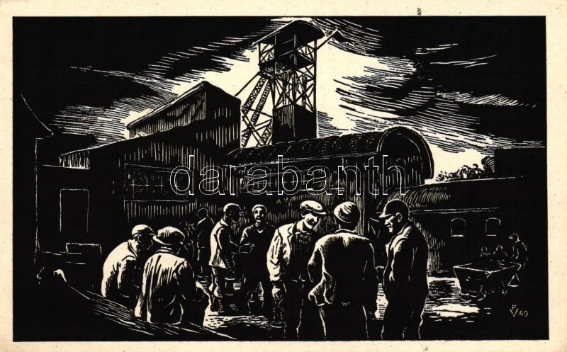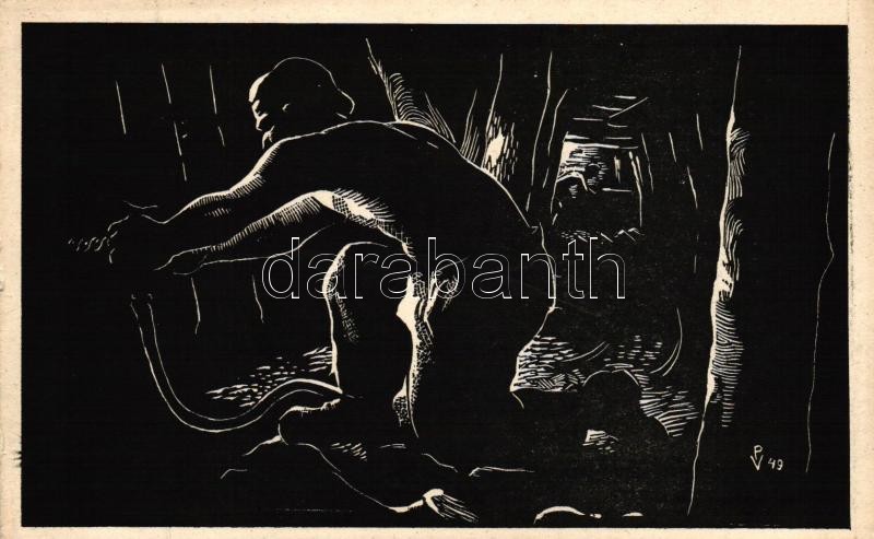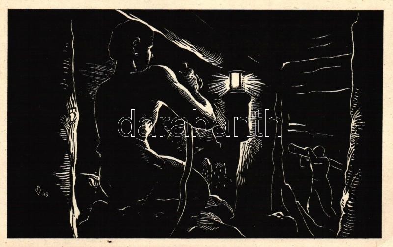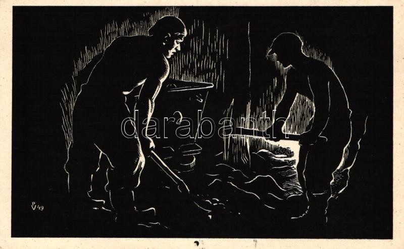 Beschreibung: 10 db RÉGI használatlan motívumlap Varsányi Pál fametszetsorozatából; bányász / 10 old unused motive cards from Varsányi Pál's woodcut series; miners