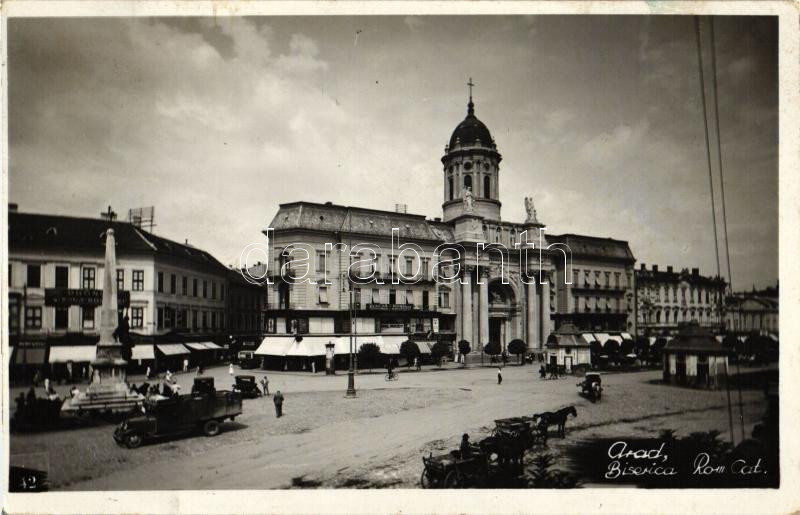 Beschreibung: Arad, Római katolikus templom, gyógyszertár, parfüm üzlet, Emil Maidt üzlete / Roman Catholic church, pharmacy, parfumery, shop, automobiles